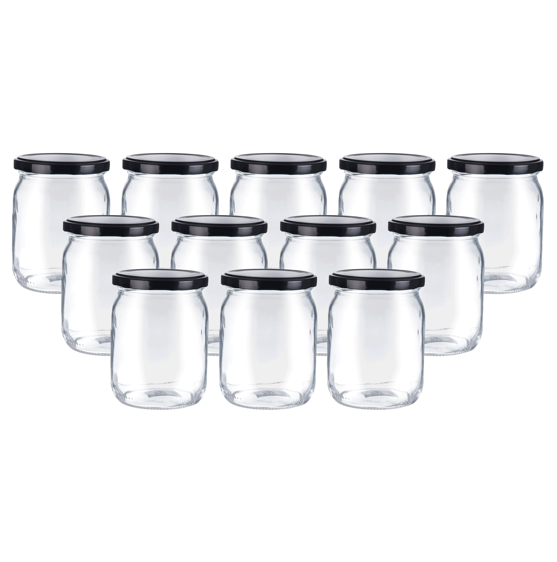Komplet zawiera 12 sztuk słoików z czarnymi nakrętkami, co czyni go praktycznym i ekonomicznym wyborem.